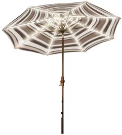 The 13′ Starlux Collar Tilt Market Umbrella in a Bronze Frame with a Sahara Stripe Canopy has lighting built into the ribs to create the perfect ambiance for your next party or gathering. The umbrella comes with a 110/12V/DC UL approved indoor/outdoor transformer, and the lights are tested for 50,000 lifetime hours.