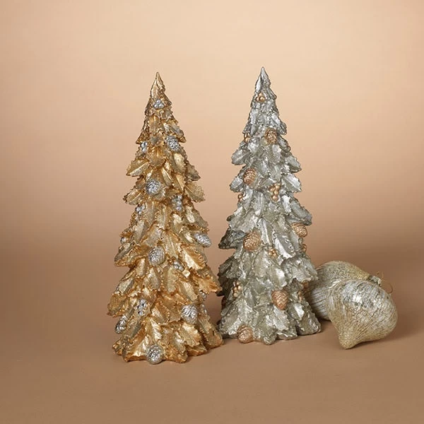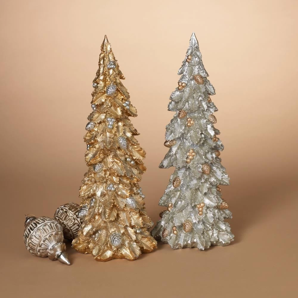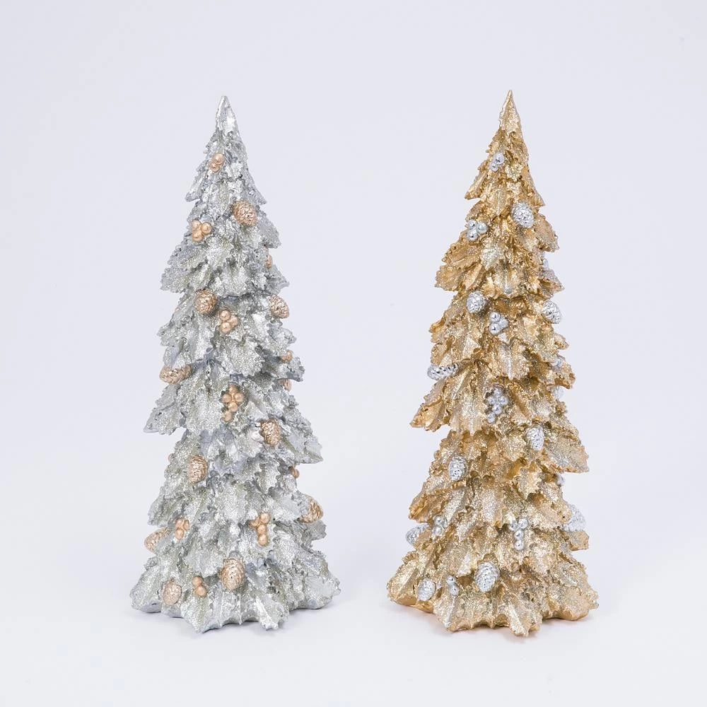 - One tree features gold leaves with silver pine cones and berries