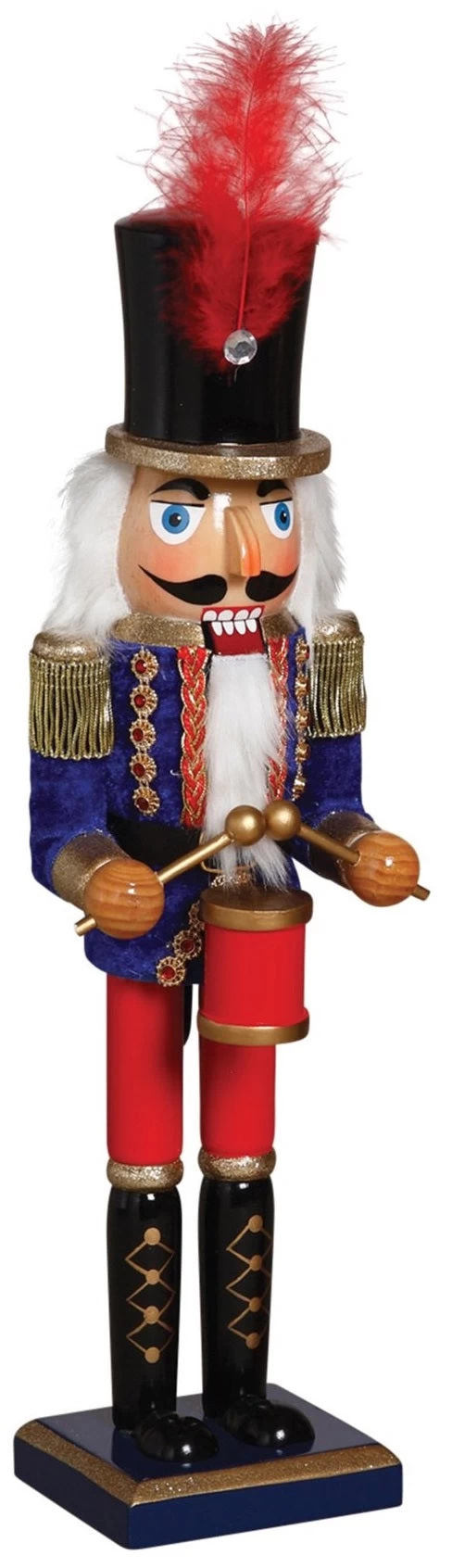- One nutcracker is wearing a top hat, is holding a red snare drum and golden drumsticks and stands atop a blue and gold wooden base