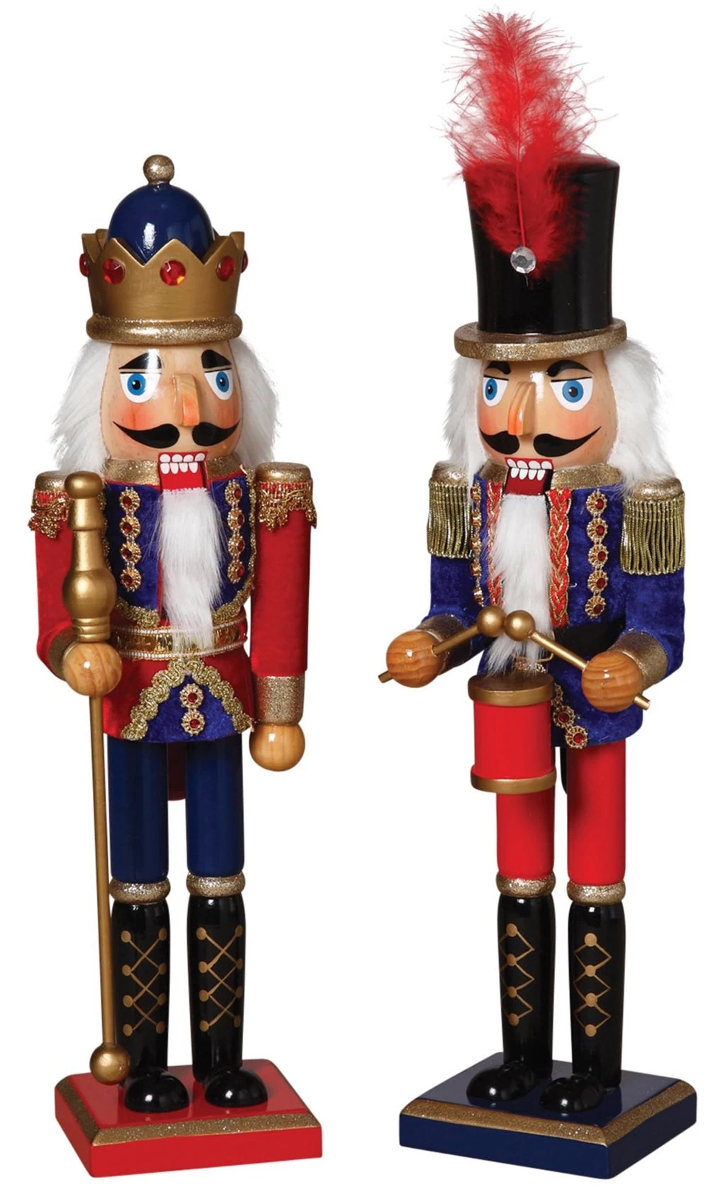 - One nutcrackers is wearing a crown, is holding a golden scepter and stands atop a red and gold wooden base