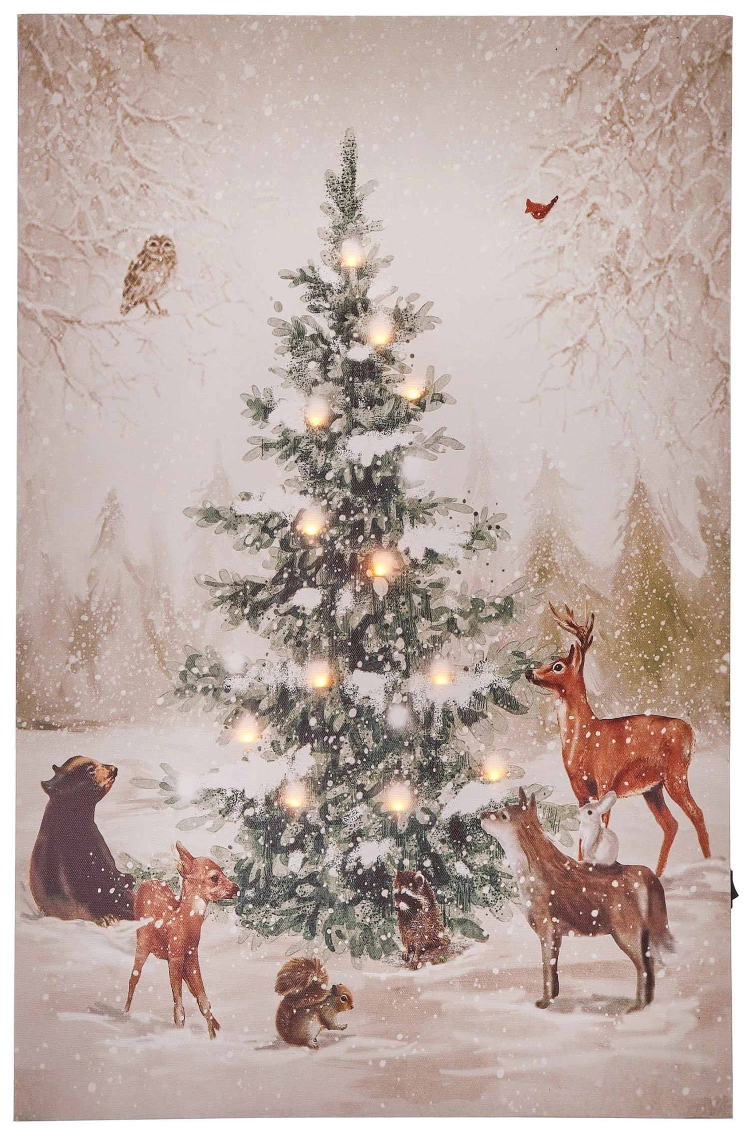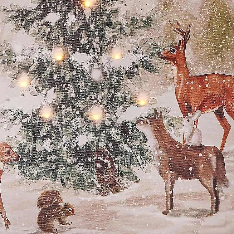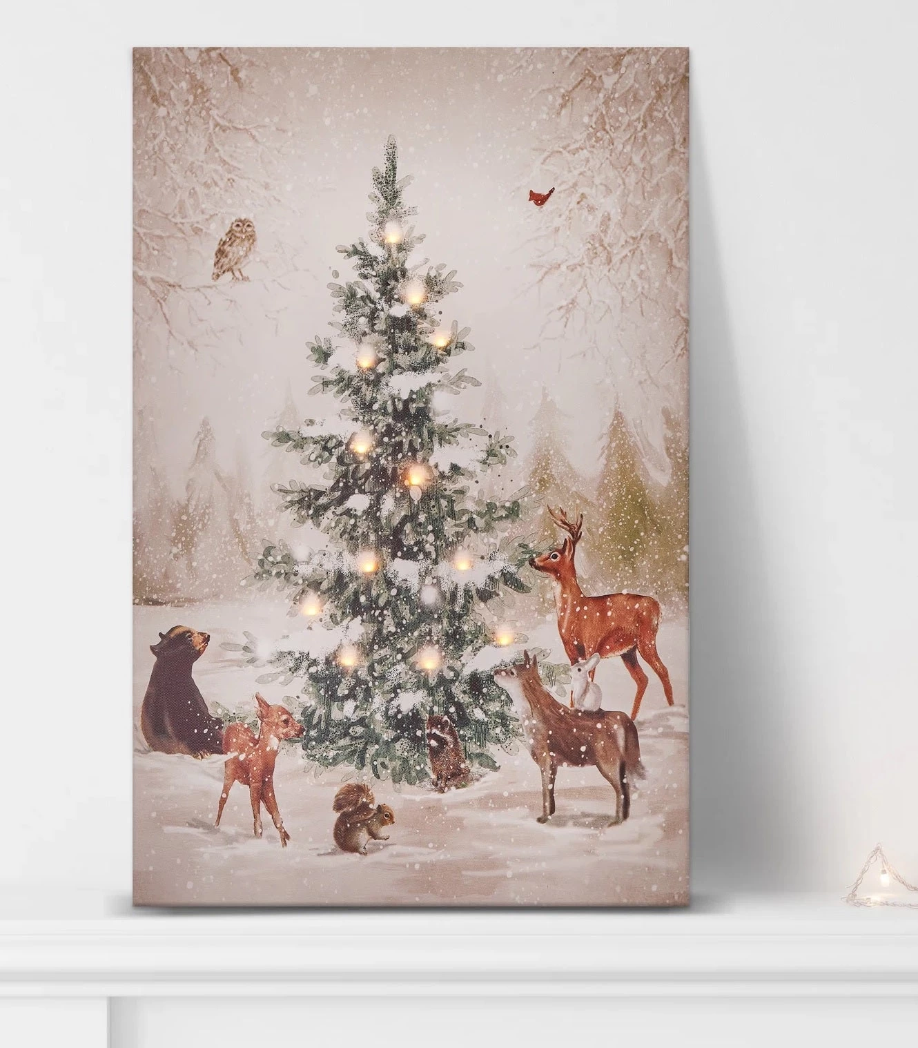 This Pre-Lit Woodland Christmas Tree Canvas Art Print will light up your home with holiday spirit! You’ll adore how the warm lights and adorable forest animals enhance the cozy atmosphere in your home.