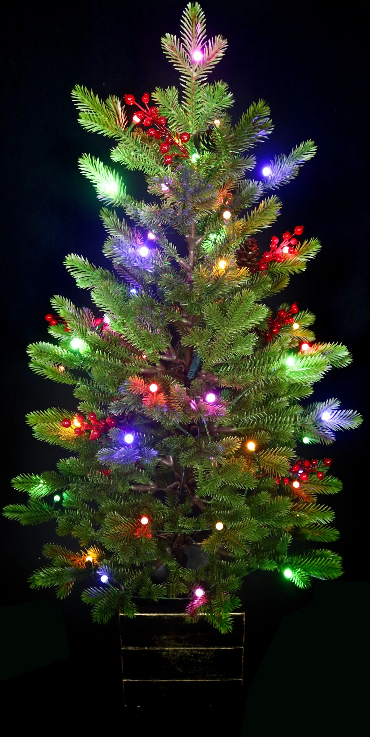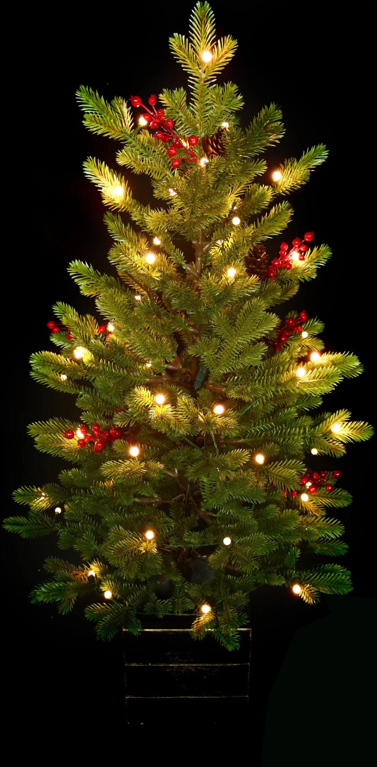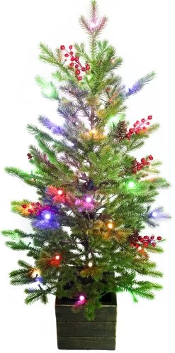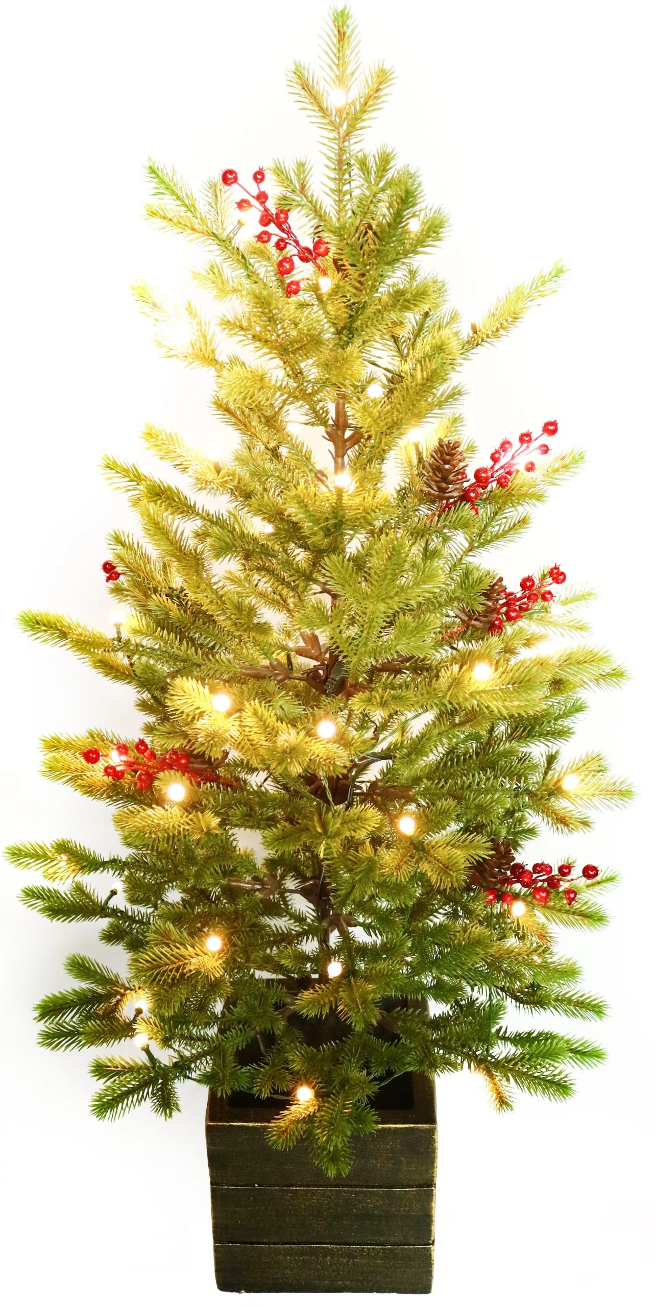 Create a magical winter wonderland in your home with this Potted Fir Tree! This lifelike mini tree features a robust silhouette of foliage made up of easy to bend branches, perfect for displaying however you please. Pre-lit with 50 Starry LED globe Lights, decorated with bright red berries and stabilized in a planter, this tree is easy to set up and will bring holiday cheer to your home for years to come.