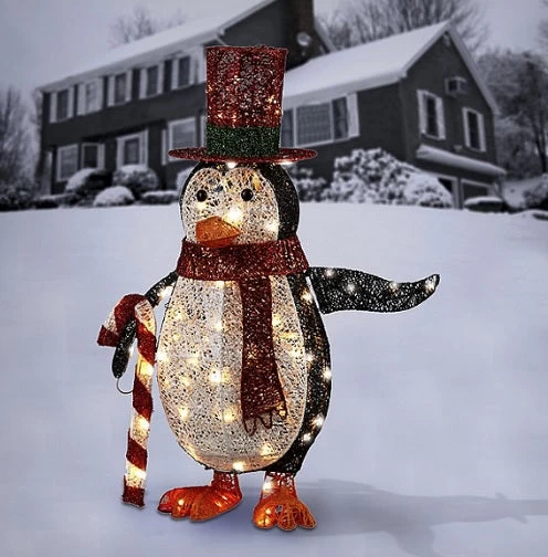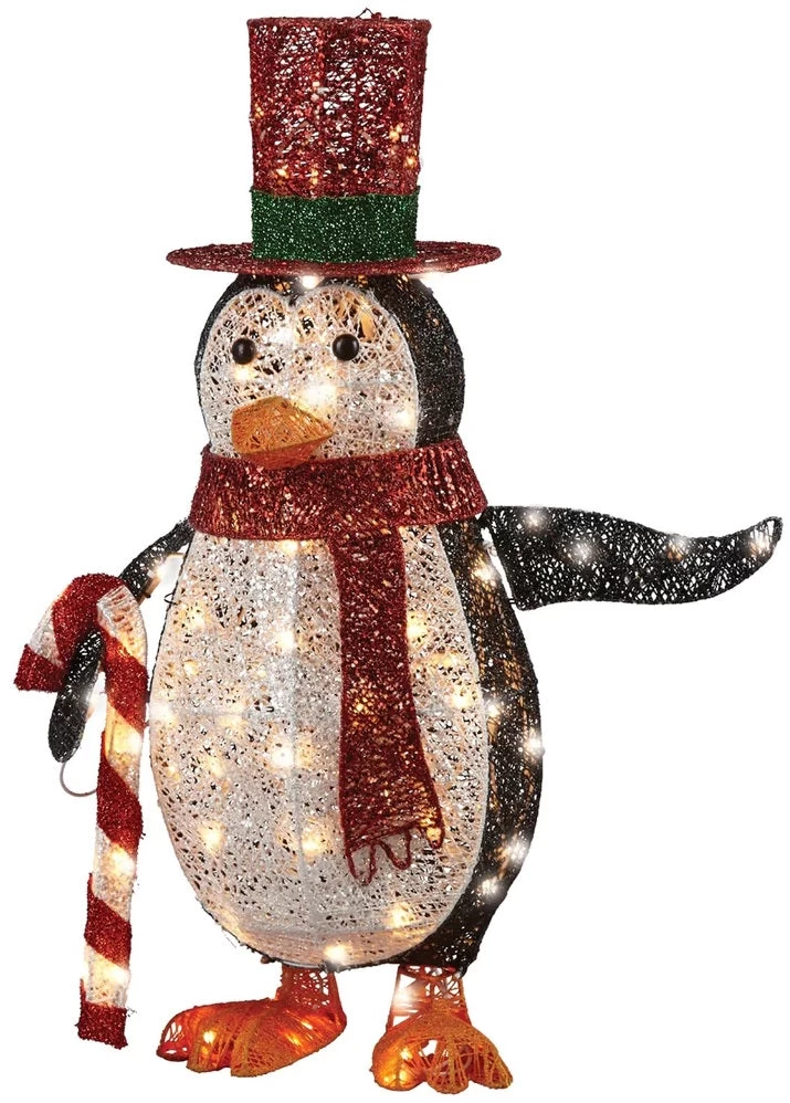 This colorful LED Penguin is made with acrylic material that is strong and durable to provide many years of enjoyment. It is pre-lit with 100 white LED lights that make this decoration sparkle and shine. Penguin features black top hat, red scarf, orange beak and feet and holds a candy cane.