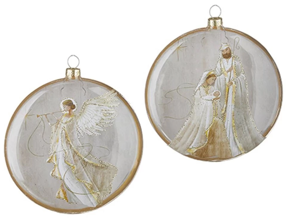One of these elegant Glass Ornaments feature the Holy Family in gold and cream colors with glitter detail. Pair with the coordinating Angel Oval Disc Ornament to complete the look of your tree.