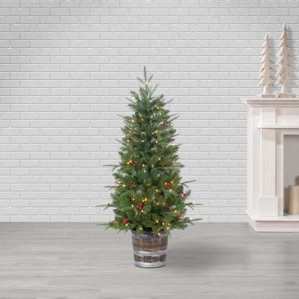 Pine cones and berries are scattered though it’s 815 branch tips that allow plenty of room for your treasured decorations. This tree rests in a gorgeous decorative barrel-styled pot for stability while adding a hint of elegance to your holiday décor.