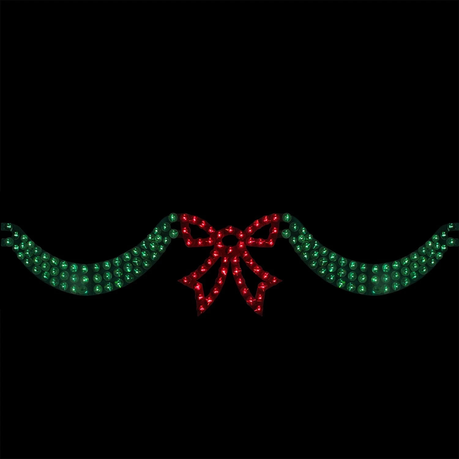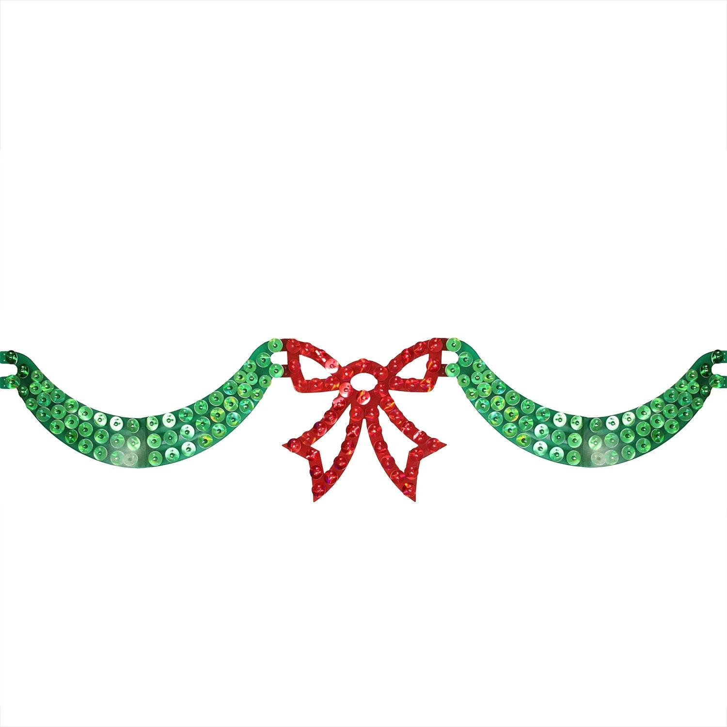 Add some festive fun to your holiday decor with this 6′ Pre-Lit Dazzling Green Swag with Red Bow Hanging Decorative. Sequins behind the bulbs give the illusion of twinkling when the wind hits them.