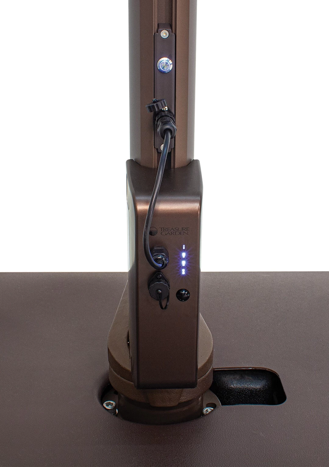 The 9′ Starlux Collar Tilt Market Umbrella in a Bronze Frame with a Champagne Canopy has lighting built into the ribs to create the perfect ambiance for your next party or gathering. The umbrella comes with a 110/12V/DC UL approved indoor/outdoor transformer, and the lights are tested for 50,000 lifetime hours.