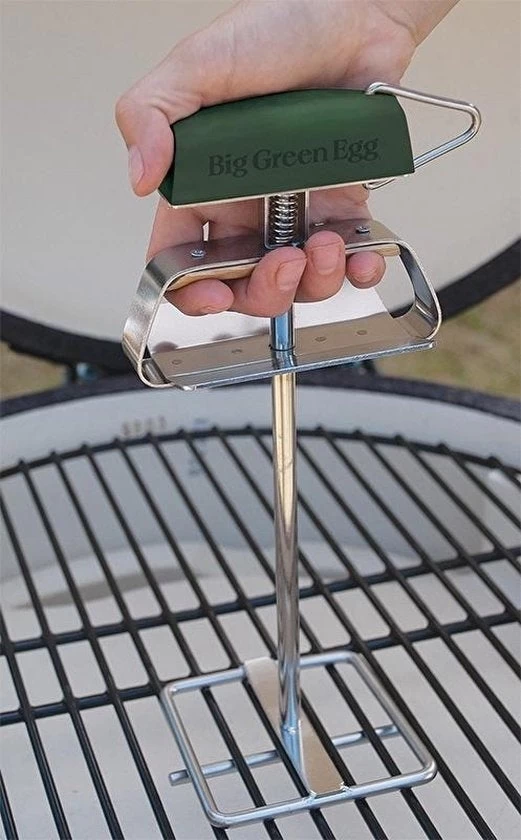 Lower the grid lifter, rotate a quarter of a turn, clamp and lift. Lifting the hot and heavy cast iron grid of your Big Green Egg, perhaps to place or remove the convEGGtor, is a hot job. However, the handyĀ Big Green Egg Heavy-Duty Grid Lifter will quickly take care of it for you. The plate under the handle of the Grid Lifter protects your hands against any rising hot air.