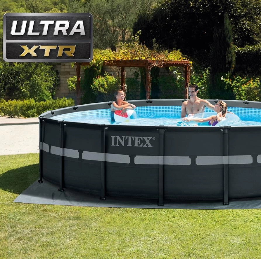 Enhance your backyard this summer with the Intex® 18ft x 52in Ultra XTR™ Frame Pool that features beautiful blue tile print and elegant graphite exterior. Have an amazing time with family and friends with the spacious pool.