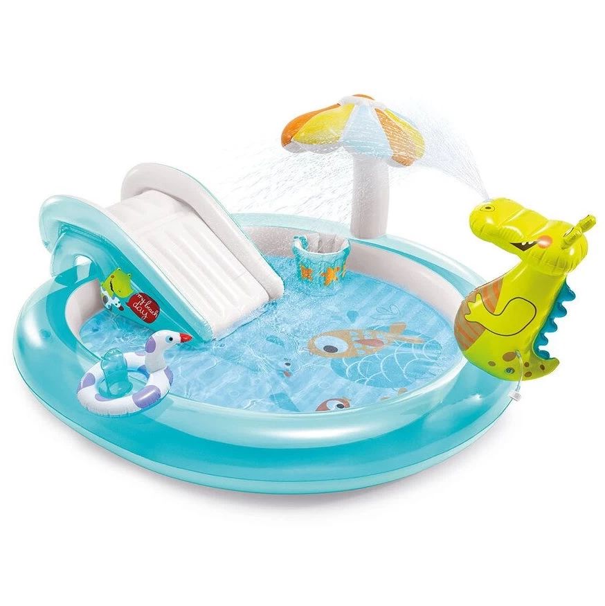 Your kids will have lots of fun splashing around in the water this summer in the Intex Gator Play Center. It also comes with a waterslide, mushroom shade, inflatable gator, baby duck and fishing bucket for extra fun and play values. The landing mat is designed with extra padding to provide comfort for your kids sitting and standing in the center. Built with durable 11ga vinyl, your kids will enjoy to play in this swim center summer after summer.