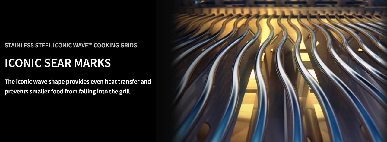 - Stainless steel Iconic Wave™ Cooking Grids provide even heat transfer and prevents smaller food from falling into the grill