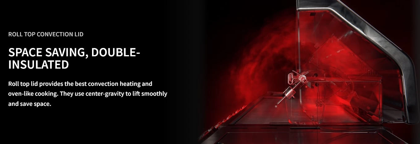 - Lift Ease™ Centre-Gravity Roll Top Lid to lift smoothly without extending past the back fo the grill, saving space