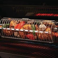 Napoleon’s Rotisserie Rack Accessory provides a premium accessory for use with your grill. The unique dual-cage design holds delicate foods in place for increased capacity and even heating. Evenly rotisserie roast whole fish, ribs, chicken, lamb chops and so much more.