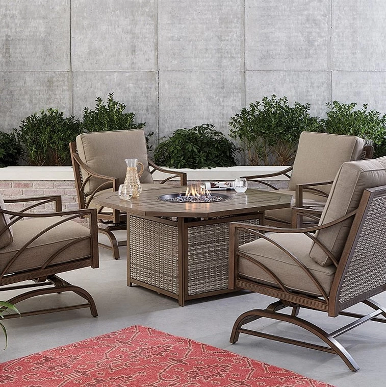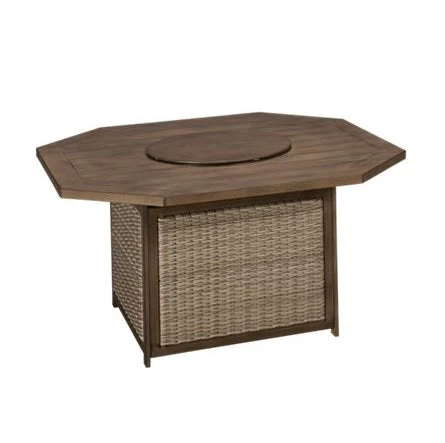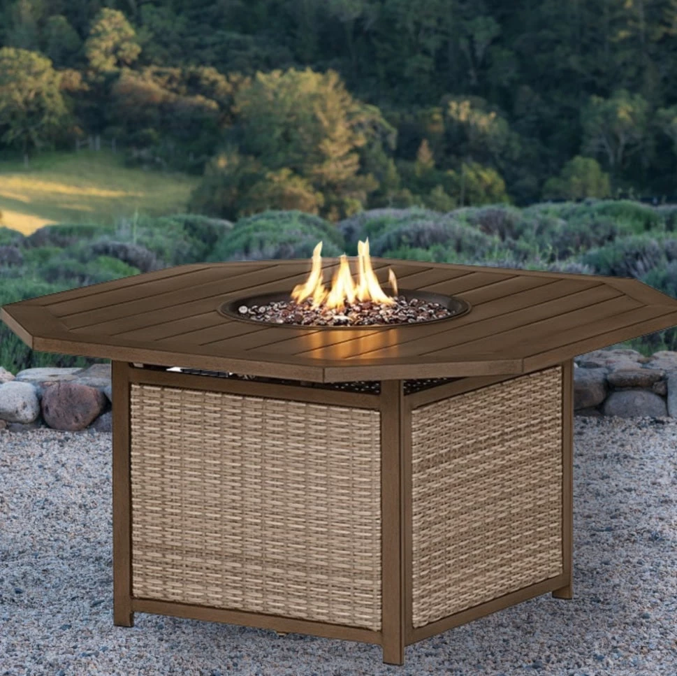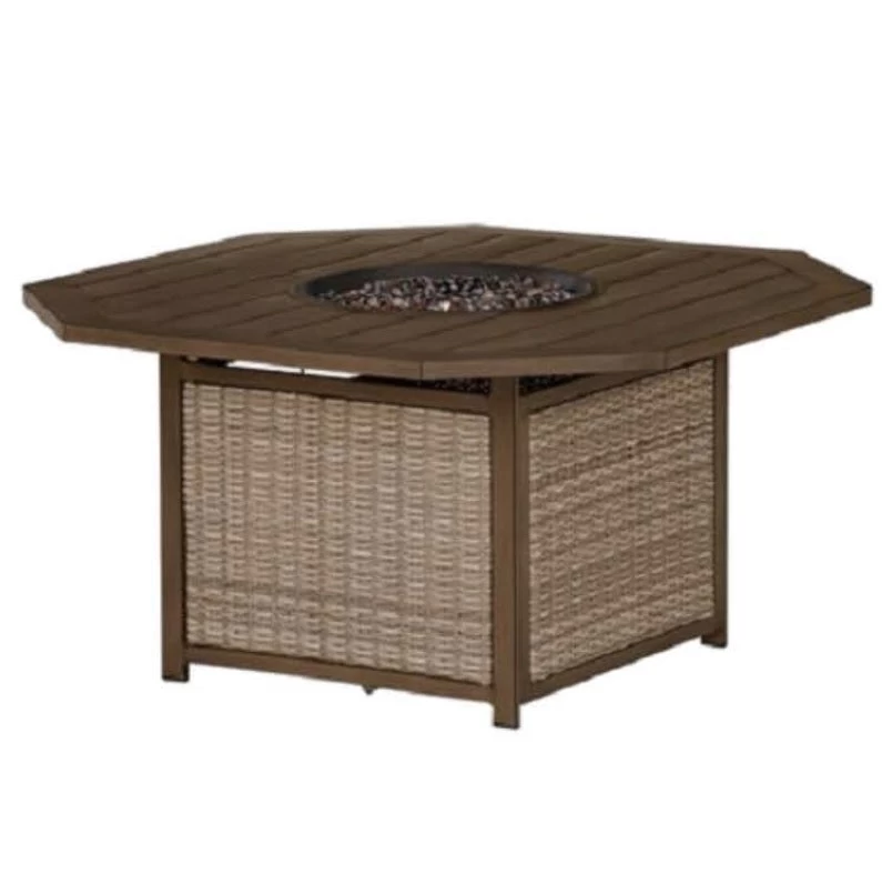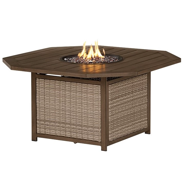 Add sculptural interest to your outdoor furniture setup with our Peoria Slat-Top KD Octagonal Fire Pit Table. This traditional-style multifunctional furniture features a planked octagonal top with a round burner cover that opens to reveal amber luster glass beads that mimic a cozy fire, and you can even adjust the flame brightness. The cast aluminum base features woven wicker sides, and offers sturdy support.