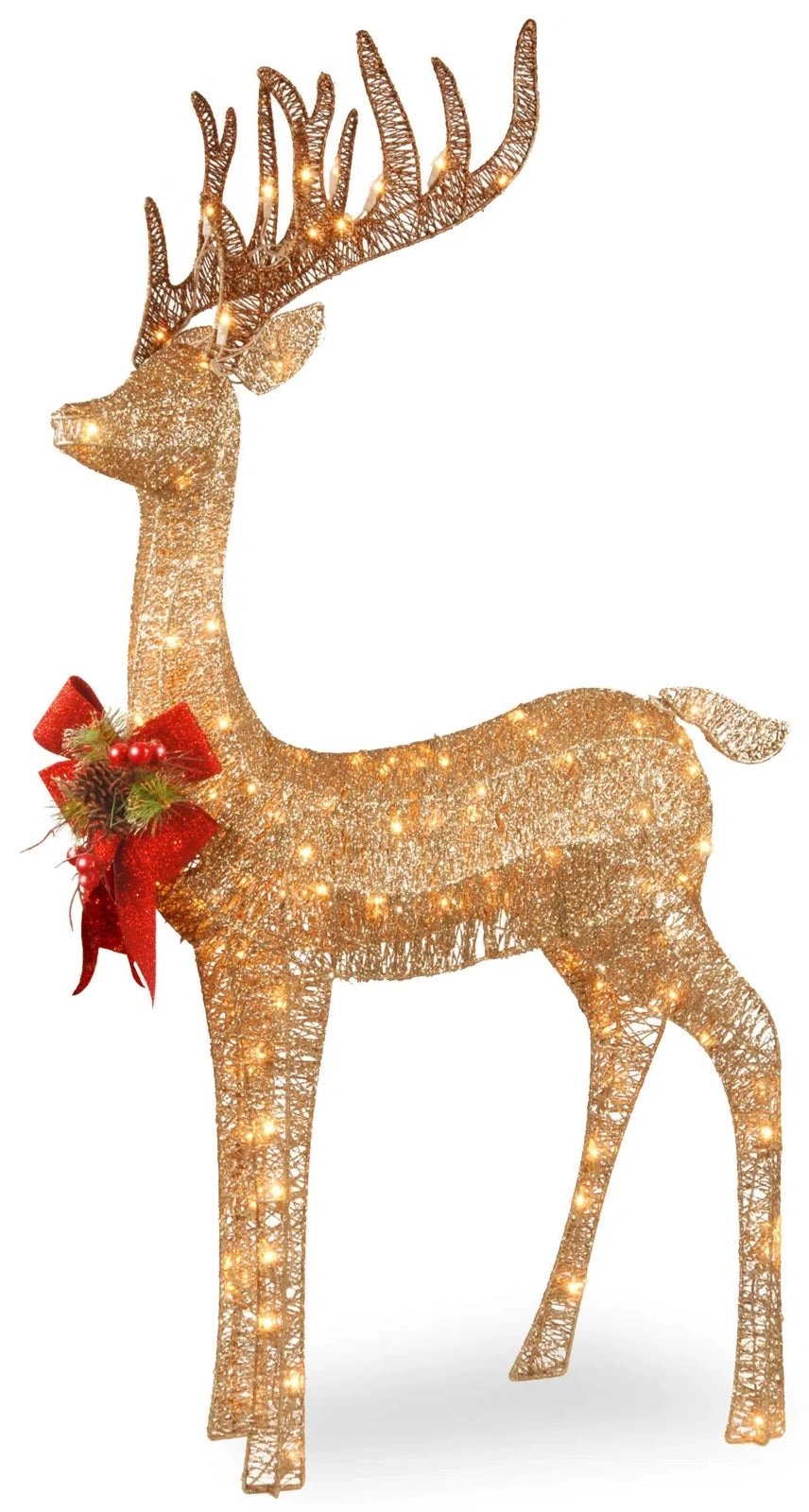 This Standing Reindeer Outdoor Yard Art Decoration brings a classic motif with a modern touch to your entryway, garden or patio. Crafted from metal in a champagne finish, it features a breezy look with thin metal wires wrapped around an internal frame, creating the figure of a slim deer with antlers. Integrated LED lighting creates a warm, sparkling glow that makes this piece a great fit for your holiday décor display.
