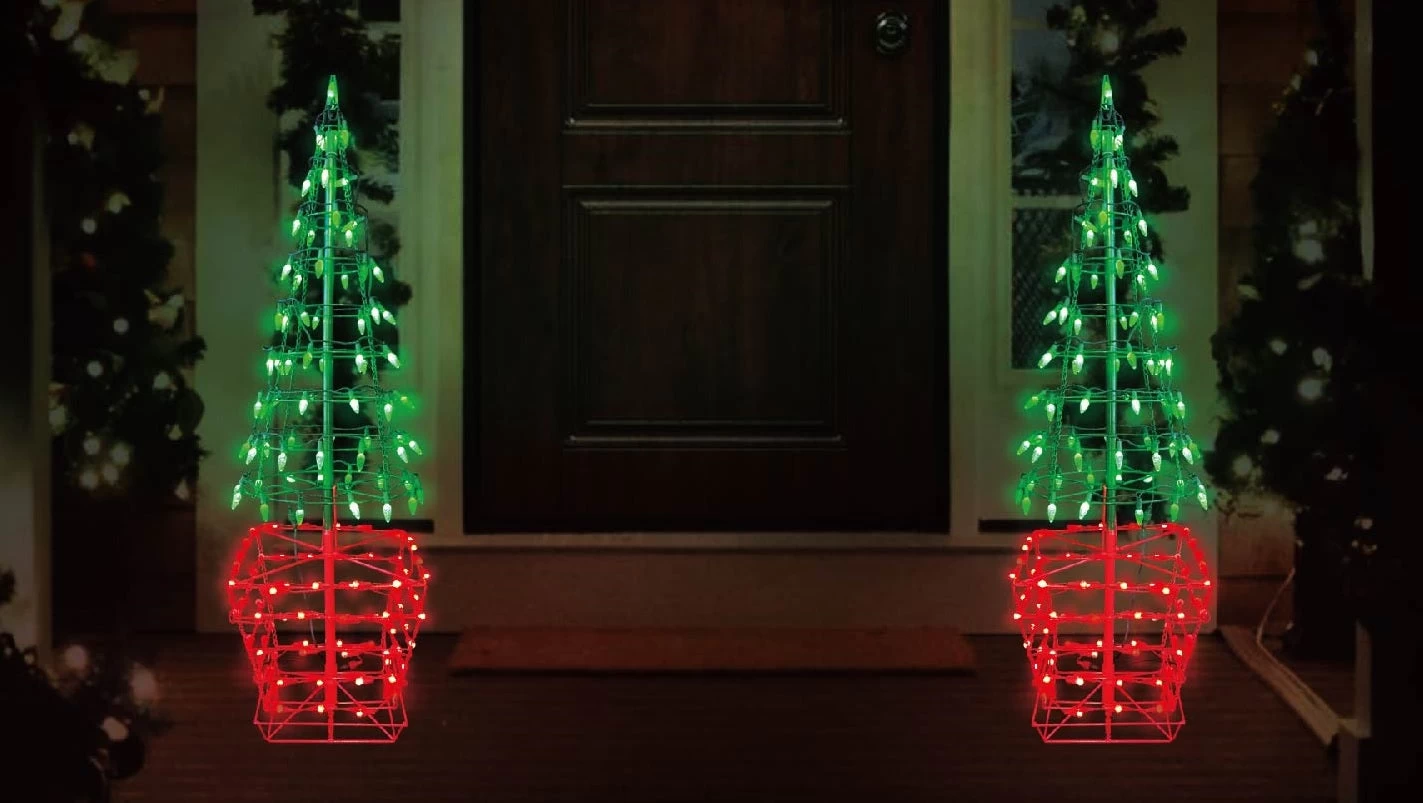 Bring a magical feel to your home or yard with this Twinkling LED Topiary Combo Set. Perfect for spreading that holiday cheer. Four stakes secure each tree to the ground for outdoor use; can be used indoors without stakes.