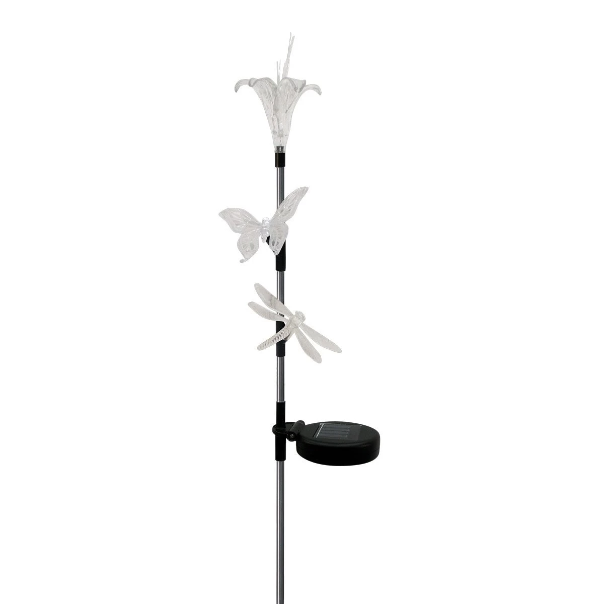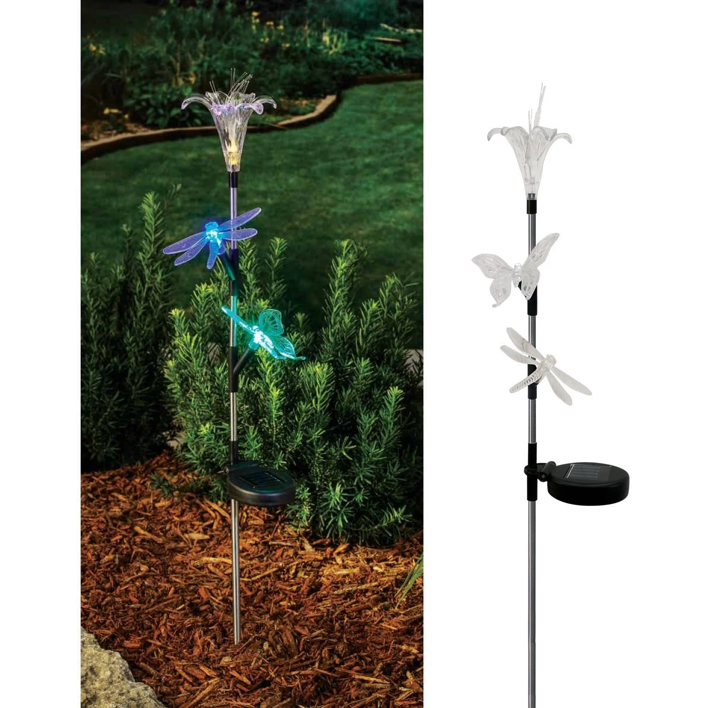 Light up your garden at night with our Solar Powered Flower and Insect Trio Garden Stake that features a butterfly and dragonfly circling a lily flower. Bright, solar-powered color LEDs charge during the day so that they can light up your garden during the night.