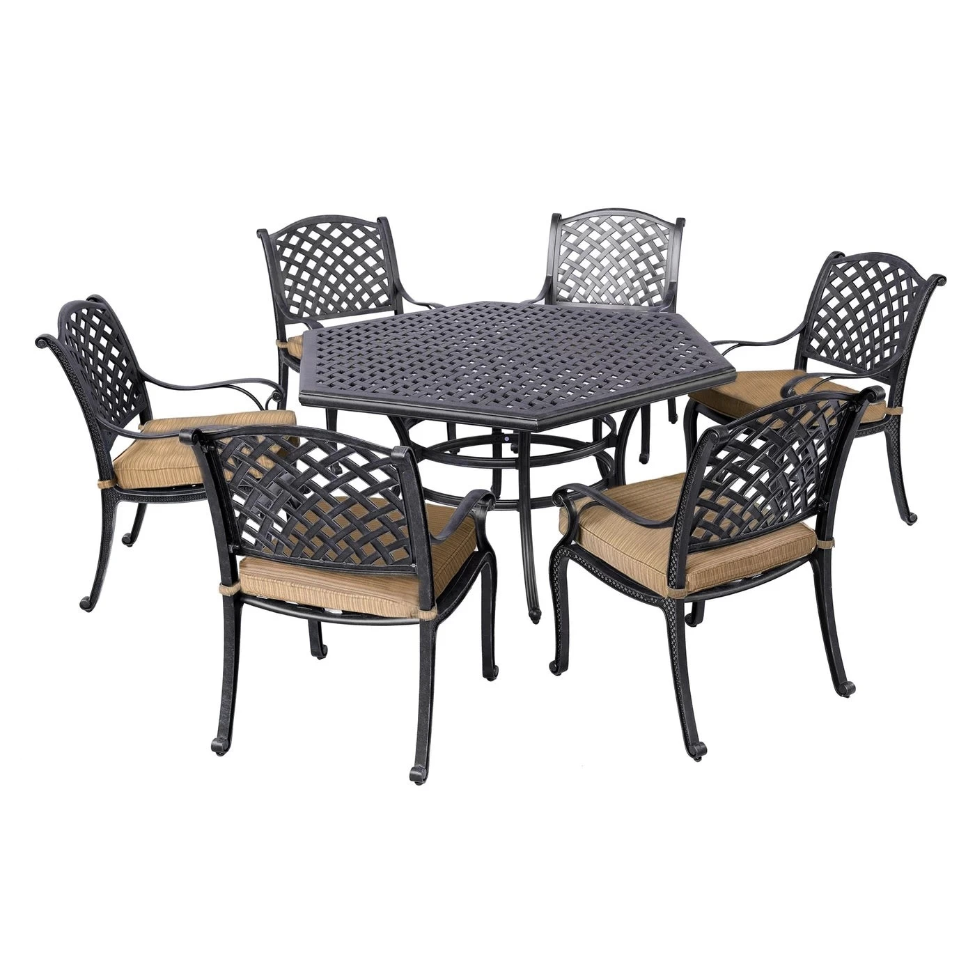 Our stylish Stonegate Cast Aluminum Cushioned Patio Dining Set offers durability and quality, as well as a timeless look. High-performing cushions and powder-coated aluminum frames keep the mood carefree and fun.