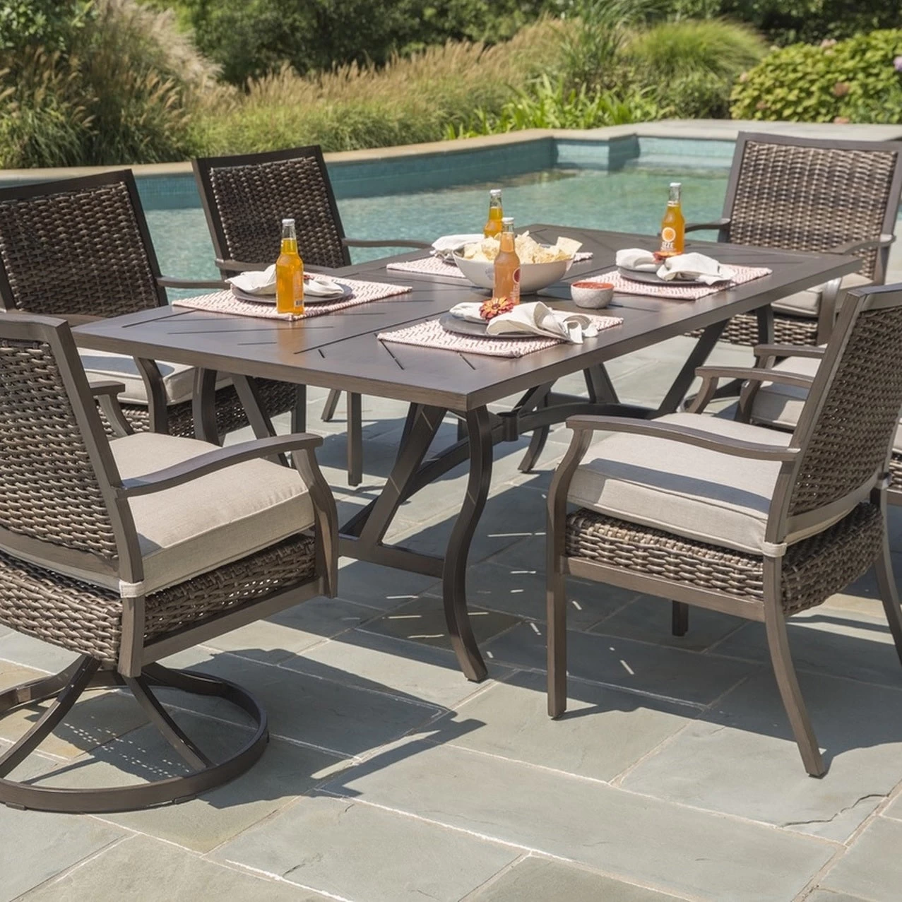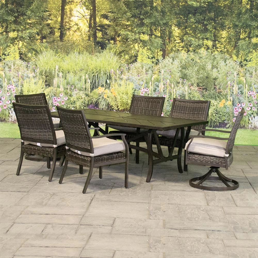 Woven frames and metal transitional designs combine to create our special Thatcher Woven Padded Patio Dining Sets! With lovely neutral-toned, coordinating all-weather cushions, your patio will always look put together for your outdoor gatherings.