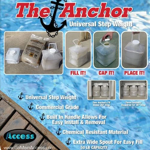 The Anchor Universal Pool Step Weight is the perfect solution to anchoring your pool steps safely, easily and mess-free. Just pop up the container and fill with sand or pea gravel. No more floating or wobbling steps, no more messy sand bags or cement blocks or algae problems!